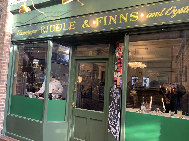 Open kitchen serving oysters, champagne and classic seafood dishes at marble-topped tables.