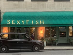 Sexy Fish is an Asian restaurant and bar located on the corner of Berkeley Square, Mayfair, serving Japanese-inspired sushi, sashimi, seafood, fish, and meat cooked on a Robata grill. Designed by Martin Brudnizki Design Studio and decorated with art by Damien Hirst, Frank Gehry and Michael Roberts, the look and